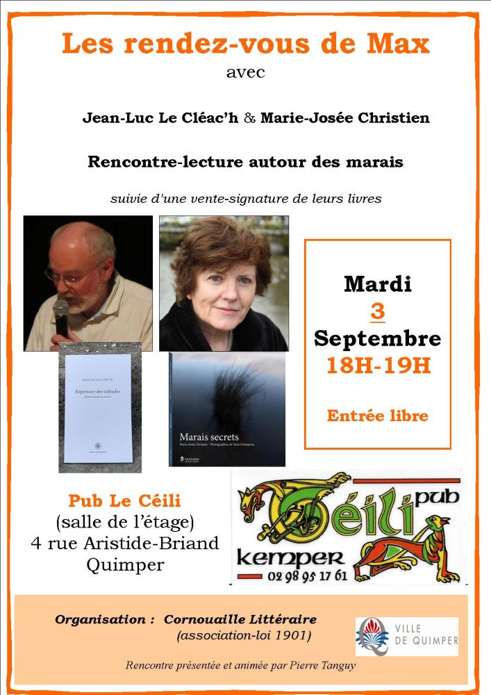 Présentée et animée par Pierre Tanguy dans le cadre des "Rendez-vous de Max" organisés par l'association Cornouaille littéraire, la rencontre-lecture accueillera deux auteurs, Marie-Josée Christien et Jean-Luc Le Cléac'h sur le thème des marais: