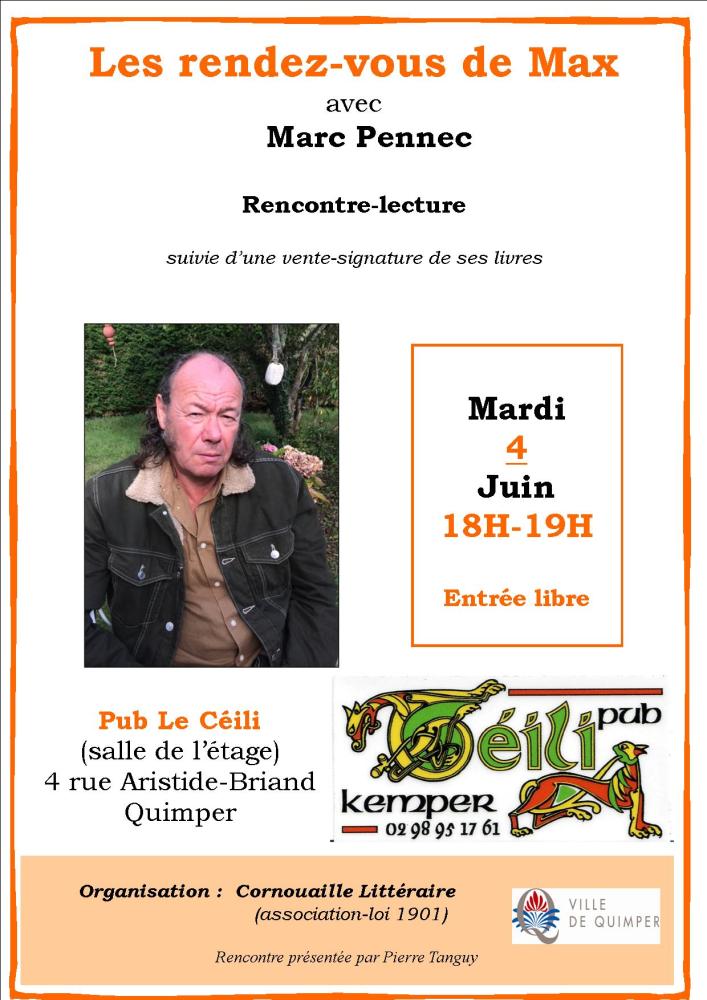 Marc Pennec, écrivain et ancien journaliste, sera l'invité des rencontres-lectures "Les rendez-vous de Max", organisées au Pub Le Céili à Quimper, par l'association "Cornouaille littéraire".
