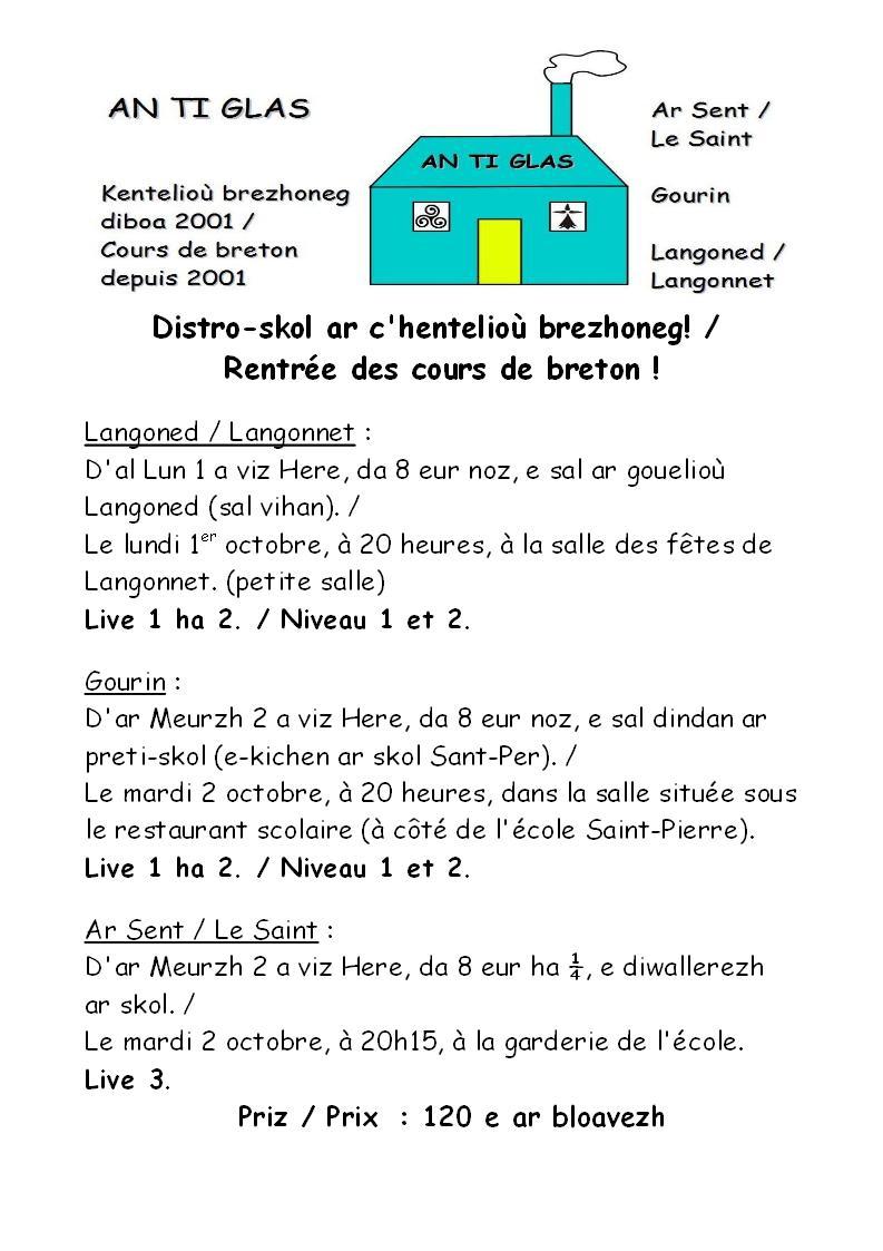 Le mardi 2 octobre, à 20h15, à la garderie de l'école. Niveau 3. Prix : 120 euros l'année.
