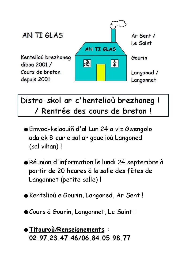 La rentrée des cours du soir de breton d'An Ti Glas aura lieu début octobre sur Gourin, Le Saint, Le Faouët. Une réunion d'information se tiendra le lundi 24 septembre à la salle des fêtes de Langonnet (petite salle) à 20h. La première causerie de l'année se tiendra au bar "Ar Stivell" (anciennement Babylone) à Langonnet, le 10 octobre à 20h, organisée par la mairie de Langonnet et An Ti Glas.