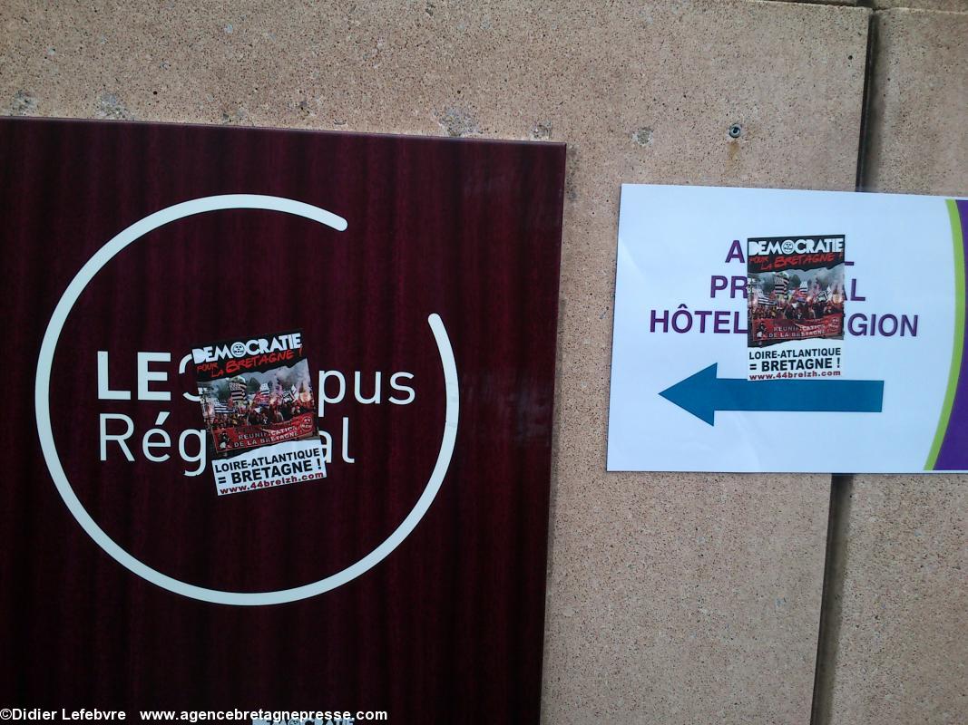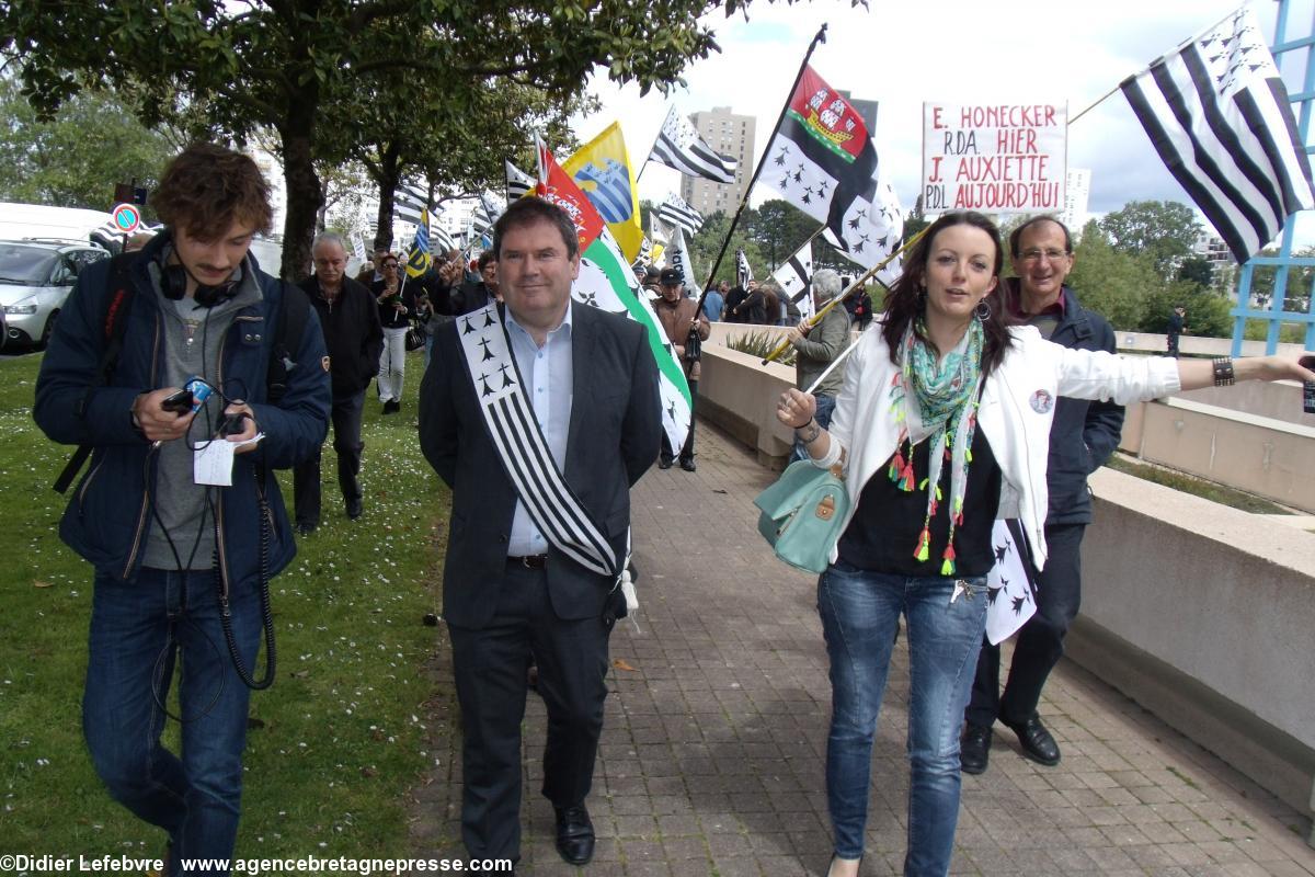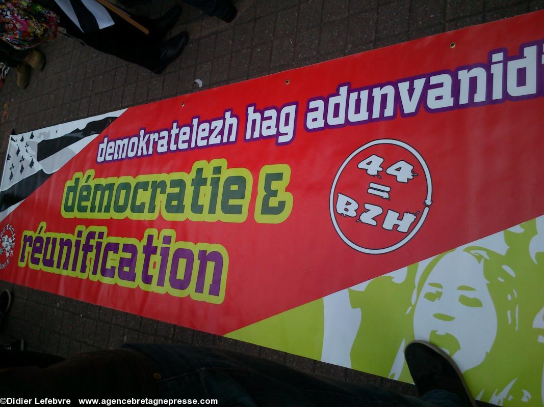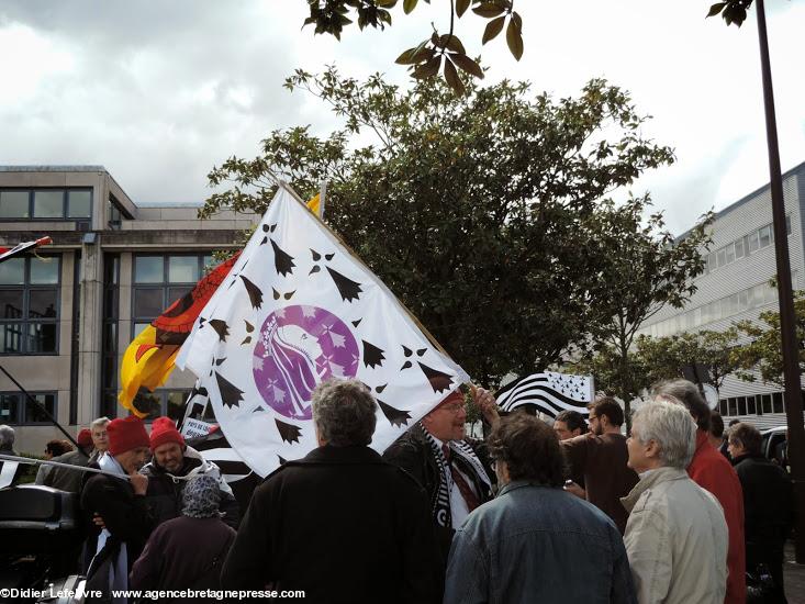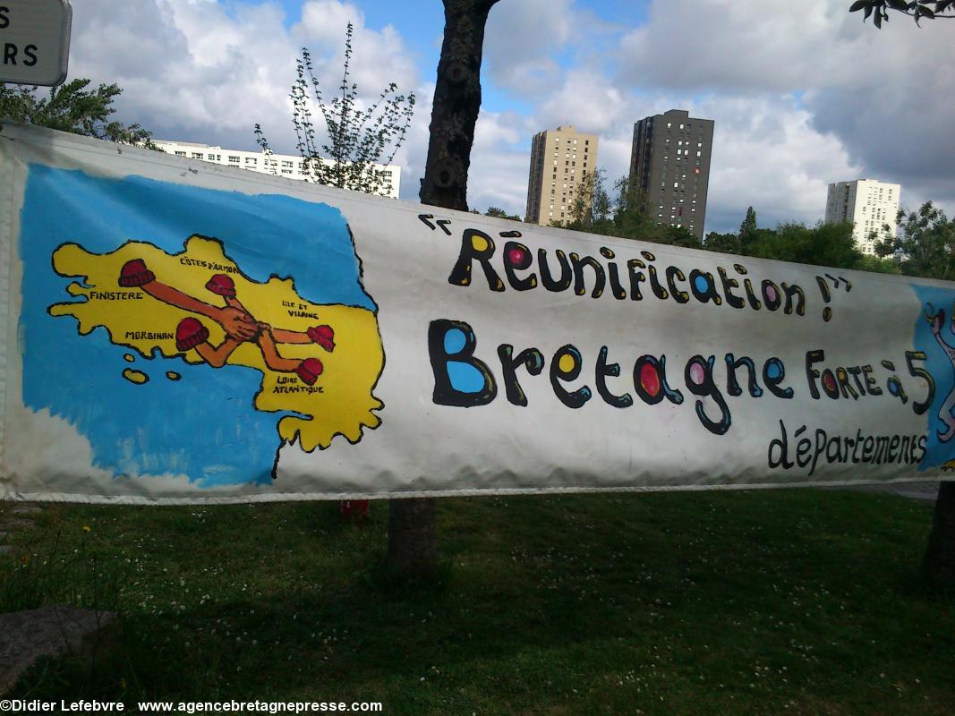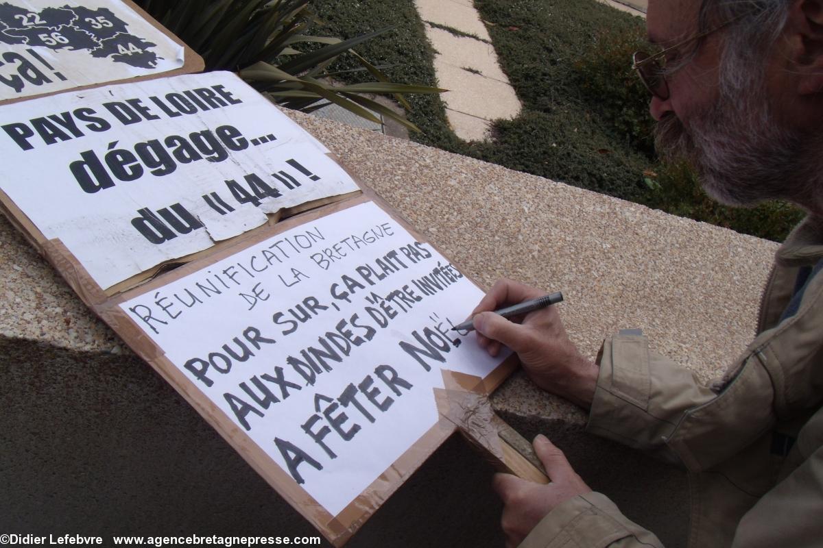 Yann-Fañch Le Bihan conclut le rassemblement, après avoir constaté le refus d'Auxiette de recevoir une délégation de militants : " Nous aurons d'autres moyens de nous faire entendre ". Ça a le mérite d'être clair. Plus de 10.000 manifestants dans les rues de Nantes il y a peu, et le message n'est pas encore entendu. Au contraire, Auxiette joue dans la provocation en faisant voter un v½u à la noix (de la noix de voeu ?) contre la Réunification, mais pour une fusion. Perdu, on est encore là. Et on va savoir se faire entendre. Autrement s'il le faut. On notera en conclusion que la police était en petit nombre, quelques cars, mais très discrète. Même un peu souriante : voir les photos.Notes