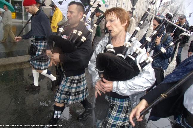: - toutes les grandes fédérations culturelles bretonnes ; - les réseaux d'enseignement en langues bretonne et gallo ; - les Associations de diffusion et d'apprentissage des langues de Bretagne, de la culture, de l'histoire ; - les Associations de sport et jeux traditionnels ; - le Réseau des Ententes de Pays (fédérations généralistes par pays) : - Médias Ce sont donc des fédérations représentant 50.000 personnes qui ont cosigné cet appel à manifester Tout le monde ne pouvait être là. Mais le chiffrage de 15.000 à 17.000 personnes n'intègre donc pas tout ceux qui soutiennent le mouvement, dont les représentants ont signé l'appel, et qui sont vigilants sur la réponse qu'apportera le législateur et le Gouvernement !!! D'autres mouvements culturels ont aussi appelé à manifester. Voir quelques articles dans les notes ci-dessous (2). En tête de défilé, une cinquantaine de sonneurs, et on en retrouvera deci-delà éparpillés dans le cortège.En Bretagne, il ne pleut que sur les c...