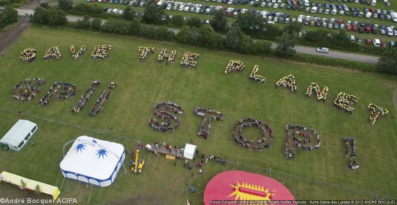 Ce matin, dimanche 8 juillet, une nouvelle grande fresque humaine, composée de 3.000 personnes a écrit sur le bocage de Notre-Dame-des-Landes un message à portée plus internationale : SAVE THE PLANET G P I I STOP ! G P I I, pour Grands Projets Inutiles Imposés, sigle qui devrait rester comme un label pour qualifier tous ces projets d'infrastructure pharaoniques et destructeurs.
