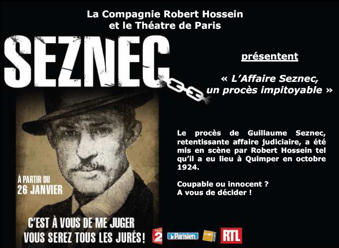 Robert Hossein vient spécialement à Brest, invité par la Fnac, pour présenter sa nouvelle pièce qui se joue à Paris, au Théâtre de Paris jusqu'au 24 avril 2010 (1). L'affaire Seznec a toujours intrigué puisque depuis 1923 elle défraie la chronique judiciaire française. Portée à l'écran en 1992 par Yves Boisset avec Christophe Malavoy, cette histoire a également donné lieu à de nombreux ouvrages. Cette fois-ci, c'est Robert Hossein qui a choisi de faire vivre une nouvelle fois Guillaume Seznec, mais au théâtre, à travers une pièce où les spectateurs ont leur mot à dire sur ce procès.Places en vente à la Fnac. Le lundi 22 février à 17 h 45