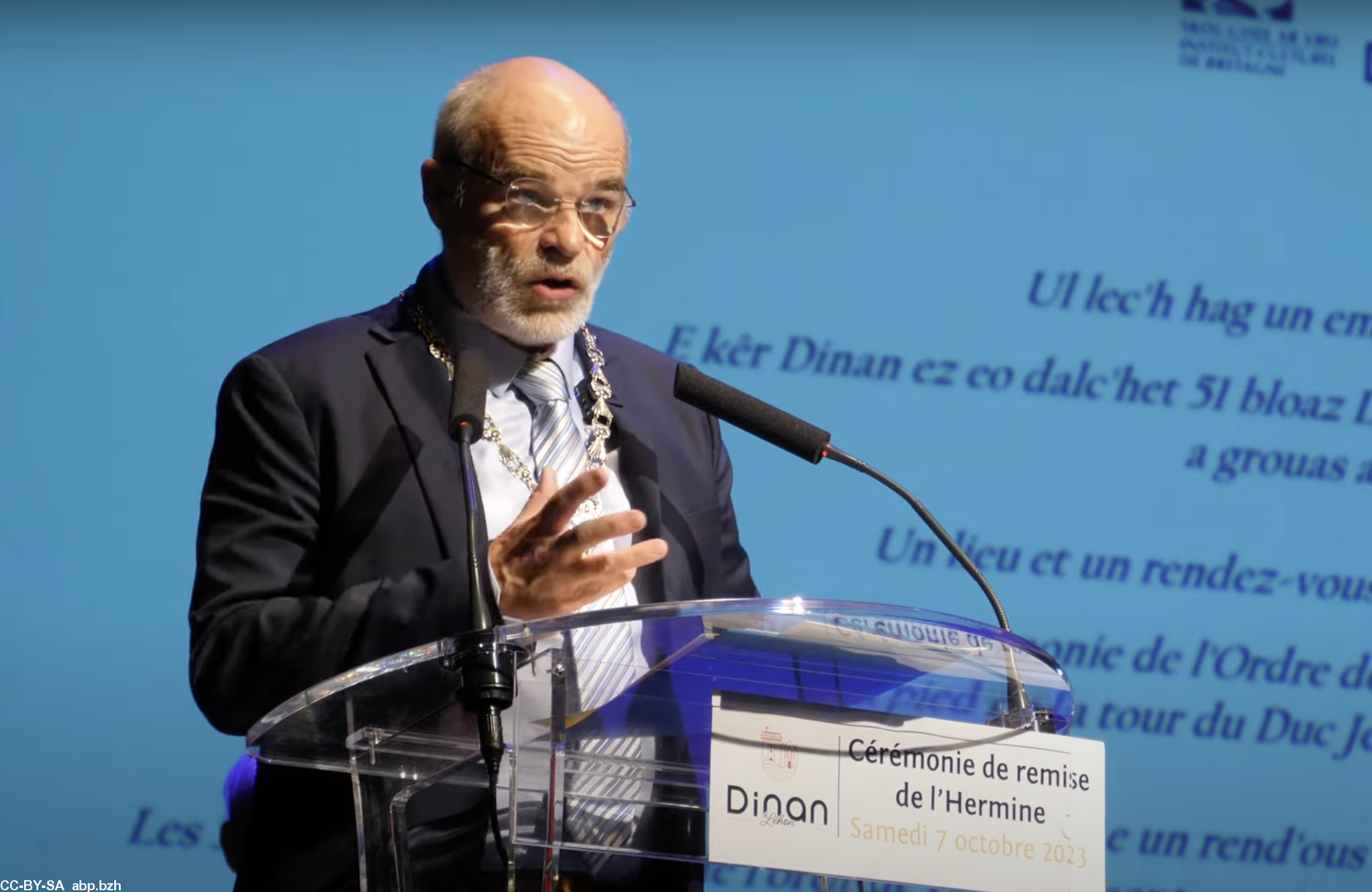 En me décernant le Collier de l’Hermine aujourd’hui, vous m’accordez un honneur qui me touche au plus haut point — et dont je vous remercie vivement —, mais qui me dépasse. Je tiens donc à le partager explicitement. Avec celles et ceux qui m’ont fait tel que je suis, en premier lieu. Mes grands parents, mon oncle, mes tantes et toute ma parentèle, qui m’ont légué une partie de leur immense richesse culturelle. Mes parents, qui m’ont transmis leur amour de la Bretagne et leur ouverture sur le large. J’aurais tant voulu que mon père (Doue d’e bardono !) puisse être des nôtres aujourd’hui. Mon frère, Erwan, aux côtés duquel j’ai combattu, qui a été emprisonné en raison de son engagement breton, et qui n’a jamais cessé d’œuvrer en faveur de la Bretagne. Mes guides : Jacques Legrée, mon sensei en karaté, qui m’a montré la voie du dépassement de soi ; et, bien sûr, Anjela Duval, dont la confiance m’a illuminé.