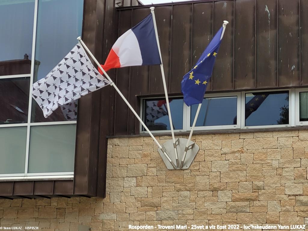 Un dra all c’hoazh, a-zivout ti-kêr Rosporden (sellit ouzh ar foto). Betek fin miz Gouere, evel e pep lec’h e Breizh, e veze ar« « Gwenn-ha-Du « » o stlakal ouzh ar voger. Diskaret ha cheñchet eo bet n’eus ket pell. Perak 'ta ? Hag ul liamm a vefe gant aozerien Troveni Mari ? Pik goulennata.