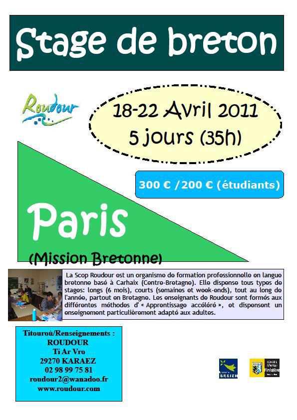Au printemps 2011, Roudour, organisme de formation à la langue bretonne basé à Carhaix, organisera 3 stages de breton hors-Bretagne. Le premier aura lieu le temps d'un week-end, à Bruxelles et durera 10h30 en tout, répartis entre la journée du samedi et la matinée du dimanche. Celui-ce se déroulera les 16 et 17 avril. Suivront deux stages à Paris, d'une semaine ceux-là (35h), à la Mission Bretonne, du 18 au 22 avril et du 13 au 17 juin. Pour tout renseignement, tarifs, niveaux, inscriptions, lieu de stage, contacter l'organisme au 02 98 99 75 81 ou par mail: roudour2@wanadoo.fr