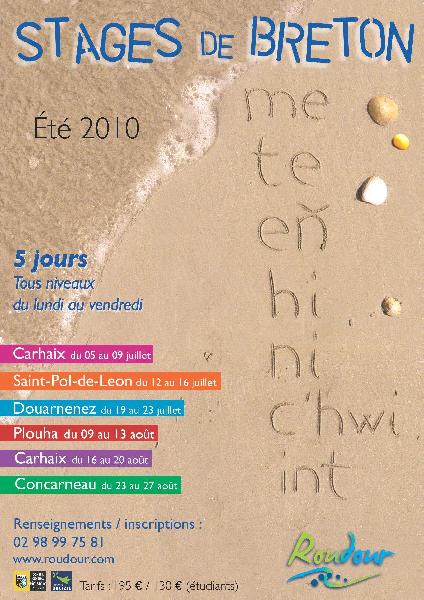 Roudour organise six stages de breton d'une semaine cet été. Ceux-ci se dérouleront au cours des mois de juillet et août à Carhaix, Douarnenez, Saint-Pol-de-Léon, Plouha et Concarneau