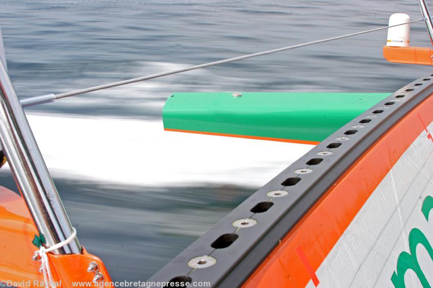 « C'est compliqué. Le vent est vraiment changeant. Je ne sais pas ce que je vais mettre comme voile. Hier après-midi, je suis passé dans le front. C'était plutôt impressionnant. Je ne voyais plus l'avant du bateau. Toute la nuit, j'ai dû réduire la toile en retirant le gennaker. Je suis un peu fatigué mais ce n'est pas le moment pour moi de me reposer car il va falloir que je manœuvre encore. J'ai tout de même pu dormir depuis le départ plus de 20 minutes par nuit mais pas beaucoup plus. Je suis toujours obligé de barrer et de surveiller le bateau. J'ai conscience que le Sodebo de Thomas Coville va rattraper une bonne partie de son retard après le front, peut-être une bonne journée de mer. La fin de course promet d'être mouvementée ».