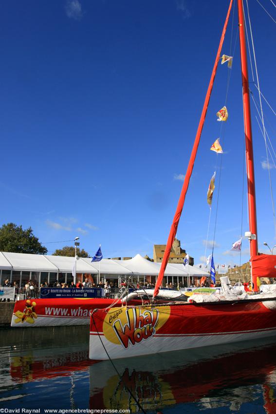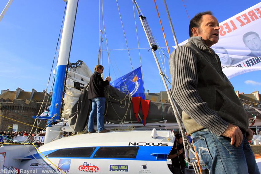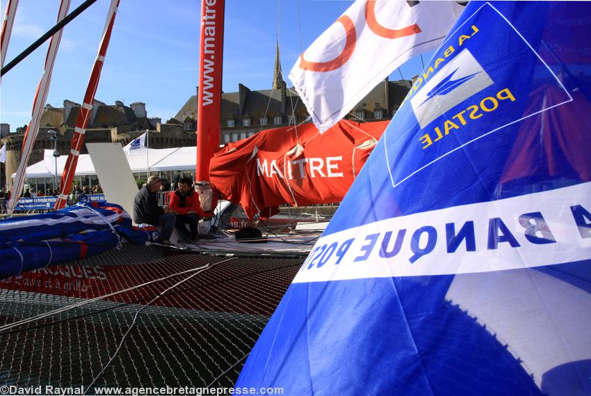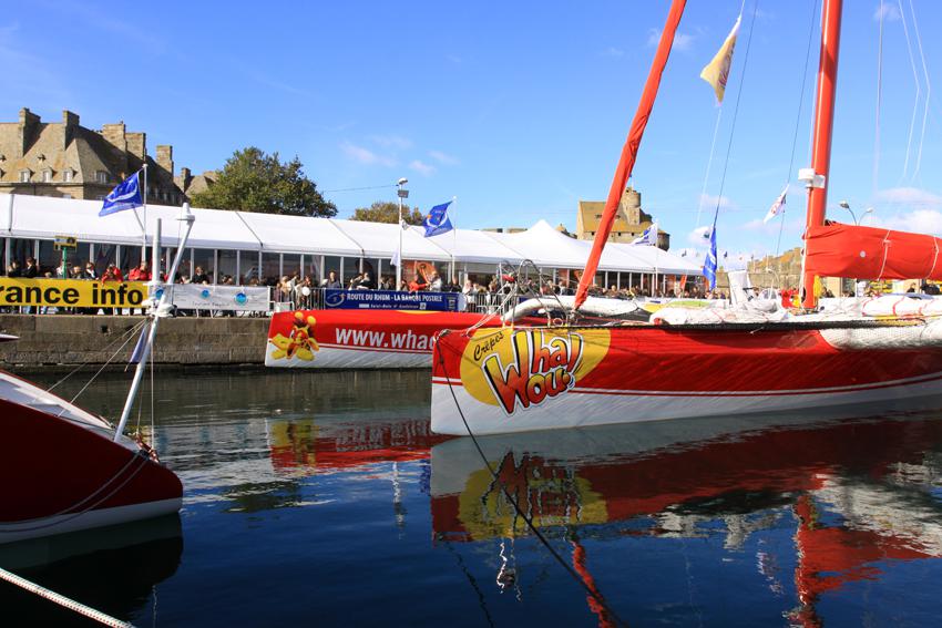 Franck Cammas, skipper de Groupama 3, classe Ultime, 4 participations à la Route du Rhum-La Banque Postale. À trente-sept ans, le marin le plus couronné en multicoque consacre plus de la moitié de son temps à naviguer. Son maxi-trimaran de 31,50 m, trop large pour passer les écluses est amarré dans l'avant-port de la cité corsaire.