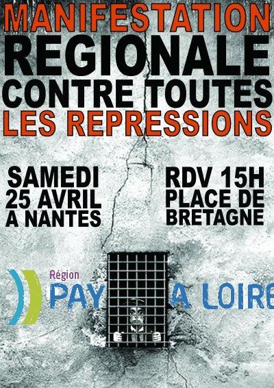 Et plus généralement contre les répressions, ici et ailleurs, de ceux qui s'approprient des logements vides, de ceux qui se voient privés de ressources (radiations Assedic, CAF…), de tous ceux et toutes celles qui osent contester l'ordre établi en aidant les sans-papiers, en écrivant ou lisant des livres subversifs… Venez manifester votre solidarité contre toutes les répressions et avec les révoltés le 25 avril à Nantes (15h place de Bretagne)