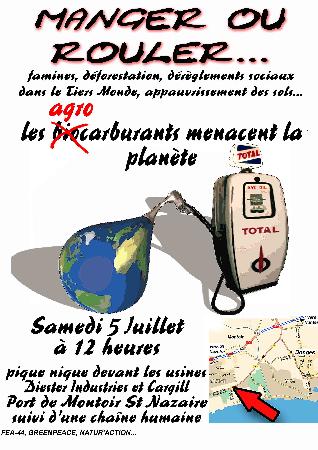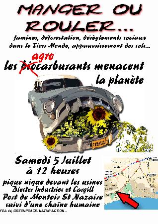 Nous appelons donc toutes les organisations et individus intéressés par les problèmes écologiques, alimentaires et de déséquilibre économique mondial, à venir au pique nique de pré-inauguration le samedi 5 juillet de midi à 17 heures sur le site Diester Industries et Cargill zone portuaire de Montoir-de-Bretagne / Saint-Nazaire.
