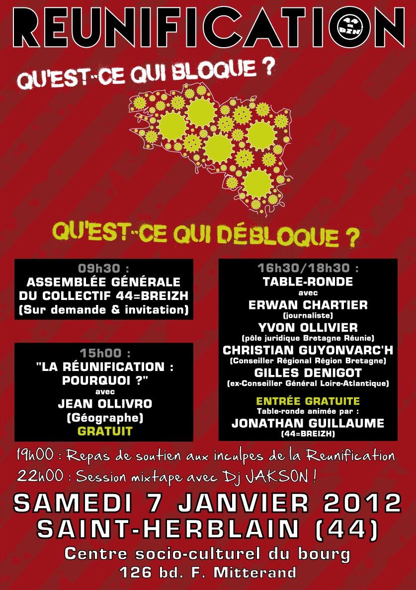 http://44breizh.com/2011/12/20/samedi-7-janvier-repas-de-soutien-aux-inculpes-journee-debat-et-informations-sur-la-reunification/ Contact collectif.44breizh@gmail.com
