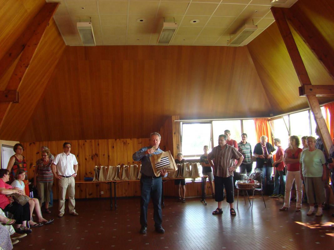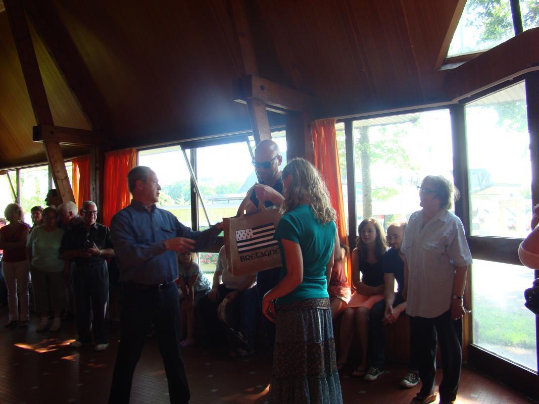 - Dominique Le Roux, président du comité de jumelage remet un sac de produits locaux de Plomelin aux familles de Betziesdorf