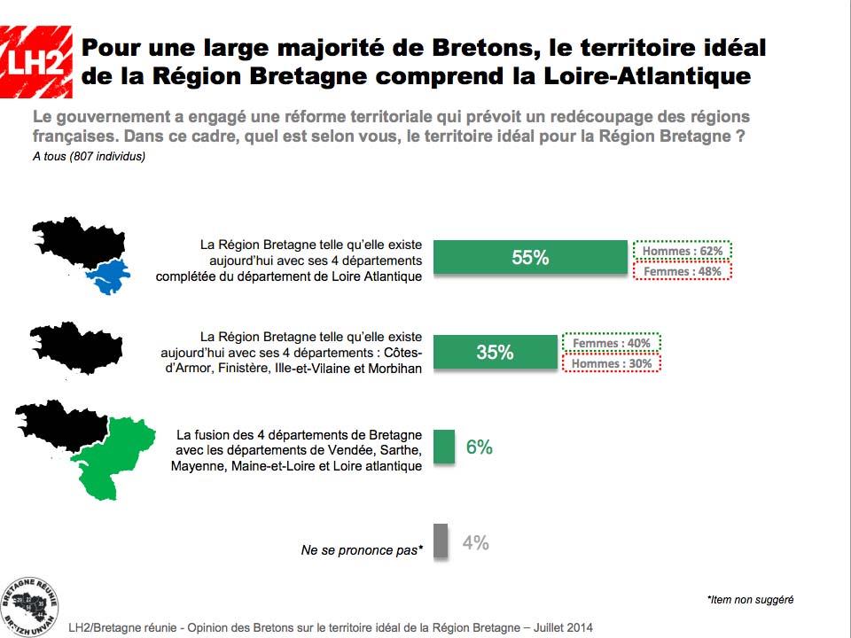 Dans un sondage réalisé par LH2 pour l'association Bretagne Réunie fait sur un échantillonnage de 807 personnes habitant la Bretagne administrative, on a proposé de choisir une, et une seule, des trois options suivantes concernant l'organisation territoriale régionale : le statu-quo, la réunification, la fusion avec les PDL. La fusion a été catégoriquement rejetée avec seulement 6% des sondés qui y sont favorables contre 55% pour le retour de la Loire-Atlantique dans la région administrative Bretagne. 35% sont pour le statu-quo et 4% ne se prononcent pas.