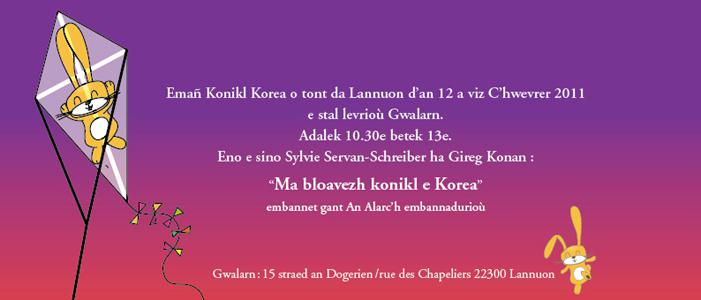 Sinadeg an albom evit ar vugale "MA bloavezh konikl e Korea" gant Sylvie Servan Schreiber ha Gireg Konan er stal levrioù Gwalarn e Lannuon d'ar Sadorn 12 a viz C'hwevrer etre 10e30 ha 13e. Sylvie Servan-Schreiber a sino he levrioù all d'an deiz-se ivez.