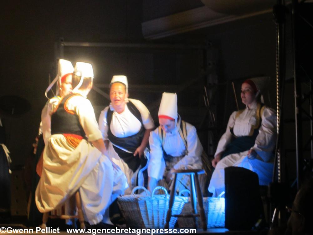 Ensuite, c'est le cercle celtique Mederien Penhars qui a raconté l'histoire d'une institutrice (Jeanne) écrivant à un amoureux, au moment des moissons. Mederien signifie en breton "Moissonneurs" ; nous avons pu voir différents tableaux de lavandières avec le linge.