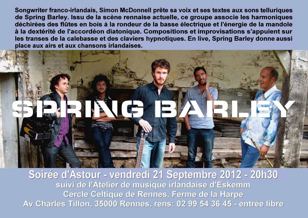 Songwriter franco-irlandais, Simon McDonnell prête sa voix et ses textes aux sons telluriques de Spring Barley. Issu de la scène rennaise actuelle, ce groupe associe les harmoniques déchirées des flûtes en bois à la rondeur de la basse électrique et l'énergie de la mandole à la dextérité de l'accordéon diatonique. Compositions et improvisations s'appuient sur les transes de la calebasse et des claviers hypnotiques. En live, Spring Barley donne aussi place aux airs et aux chansons irlandaises.