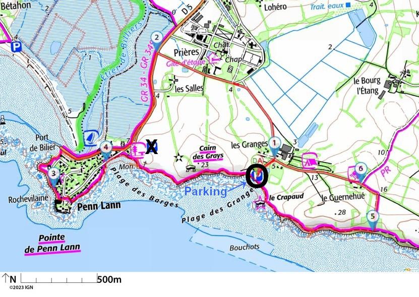En venant de Lorient ou de Vannes, prendre la N165 en direction de Nantes puis la sortie 19 Muzillac, enfin la route en direction de Billiers (D5). À la sortie de Billiers, suivre à gauche la direction « Les Granges », et aller toujours tout droit vers la plage où se situe un grand parking.