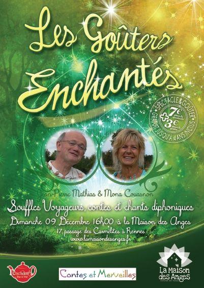C'est dans le cadre des RDV magiques "Les Goûters Enchantés", le 2ème dimanche de chaque mois, dans ce centre de yoga, dirigé par Stéphanie Launay, qu'est programmé ce spectacle du duo Mona Couasnon et Jean-Pierre Mathias : "Elle de son chant harmonisant les gens, Lui de ses paroles, les nourrissant." D'où vient que les humains ont le goût du chant, des vibrations, du son, de la musique ? Des contes de la mémoire du monde en ont gardé le secret. Les improvisations vocales évocatrices de Mona Couasnon voguent dans plus d'une dizaine d'aires culturelles et autres ambiances : lever du matin, flûte, grégorien, arabe, asiatique, "chamanique", diphonique, ... Les contes de Jean-Pierre Mathias donnent à "voir" la musique essentielle pour la vie humaine, tant avec la fille au tambourin magique (Inuit), qu'en compagnie du maître musicien (Vietnam), à-travers le chant des pierres de Bretagne, et celles de hautes montagnes lointaines, la voix du vent dans les bois amérindiens, ...