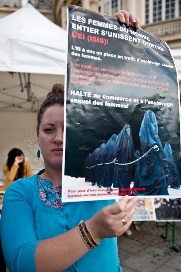 Vendredi soir a été un temps fort avec prises de paroles des présidents d'Amara - Maison du Peuple kurde et des AKB. La présence nombreuse de femmes a été remarquée. Des femmes kurdes, mais aussi des représentantes de l'UDB et des AKB. On pouvait lire, sur une pancarte dénonçant le trafic d'esclavage sexuel mis en place par le prétendu « Etat islamique » : "Les femmes du monde entier s'unissent contre l'EI?".
