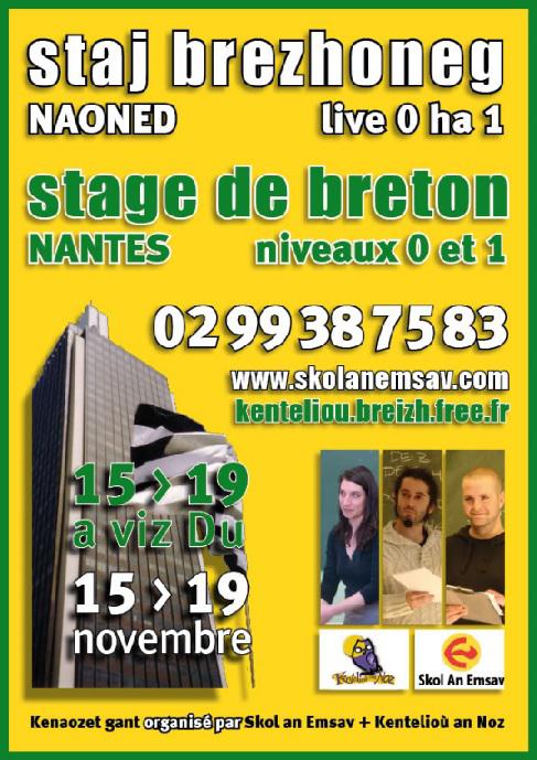 Un stage de breton est proposé à Saint-Herblain du 15 au 19 novembre. Stage intensif de 35 heures co-organisé par Skol an Emsav et l'association Kentelioù an Noz