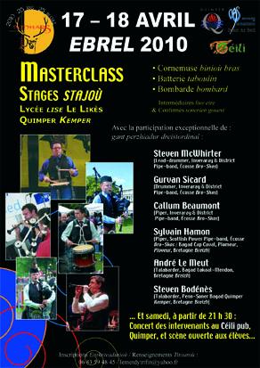 . Dans le cadre de ses 25 ans, le bagad Penhars organise un masterclass-stage destiné aux sonneurs de niveau intermédiaire et confirmé. Talabarderien, batteurs et pipers pourront profiter de la venue de musiciens reconnus et experts dans leur domaine, que l'on ne présente d'ailleurs plus : André Le Meut, Steven Bodénès, Gurvan Sicard, Sylvain Hamon. Le bagad crée aussi l'événement en invitant deux sonneurs écossais : Steven McWhirter : Ancien batteur au Simon Fraser University Pipe-band (Vancouver), il joue actuellement avec Inveraray & District Pipe-band (Écosse, Grade 1) où il mène et forme les jeunes batteurs. Champion du monde des batteurs solistes en 2006, il est considéré aujourd'hui comme l'un des plus talentueux au monde. Callum Beaumont : Callum a joué avec plusieurs pipe-bands, dont Shotts & Dykehead, Simon Fraser University,... avant de rejoindre l'équipe d'Inveraray. Son nom apparaît régulièrement, depuis quelques années, dans les classements des concours solistes de haut niveau, en Écosse et au-delà. Il a notamment remporté la Médaille d'argent à Oban en 2006, et a fait parti des lauréats de la Médaille d'or en 2008. Niveaux : Pour chaque instrument, les stagiaires seront répartis en deux groupes, « intermédiaire » et « confirmé », s'adressant respectivement à des sonneurs de niveau 3e / 2nde et 2nde / 1ère catégorie. Les 17 et 18 avrilEt le samedi, à partir de 21 h, au Céili Pub à Quimper un Concert des intervenants et scène ouverte aux élèves ! Renseignements et Inscriptions :