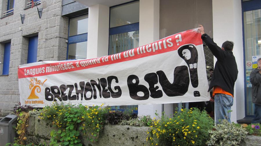 11e30, 15 stourmer bennak eus Ai'ta ! a za tre er Post, gwisket gant o zi-chirtoù orañjez ha maskloù gwenn war benn pep hini. An holl a c'hourvez war al leur p'emañ lod all er maez o staliañ ur pezh mell giton skrivet warni « Brezhoneg bev ! langues minorisées, à quand la fin du mépris ? ».