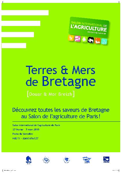 Pour la 4e année consécutive, Les Chambres d'Agriculture de Bretagne, le Comité Régional des Pêches de Bretagne et les Sections Régionales Conchylicoles de Bretagne Nord & Sud, avec le soutien financier du Conseil Régional de Bretagne, s'associent pour représenter la Bretagne du 27 février au 7 mars prochain au Salon International de l'Agriculture.