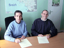 Afin d\'appuyer l\'étude de la toponymie occitane par l\'I.E.O. et de permettre de suivre de manière professionnelle la mise en place de la future signalisation bilingue, l'Office de la Langue Bretonne a accepté de partager son expérience en ce domaine et de confier à l'I.E.O. la structure de sa base de données toponymique élaborée pour normaliser l\'orthographe des toponymes et assurer le suivi de la signalisation bilingue. Une convention de collaboration à été signée officiellement lors de cette rencontre à Carhaix entre Fulup Jakez, directeur de l'Ofis et Jan Moreu, directeur de l'I.E.O. L\'échange de bonne pratique en matière d\'aménagement linguistique permet aux uns de profiter de l\'expérience des autres. De plus en plus de collaborations concrètes s\'instaurent ainsi entre l\'Occitanie et la Bretagne.