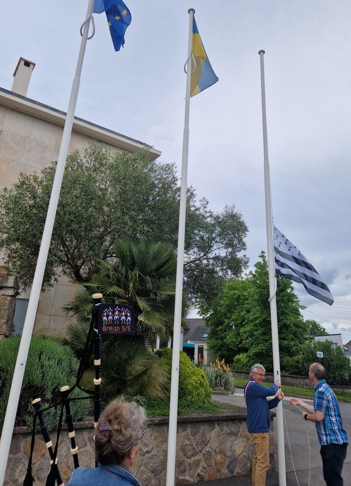 Samedi 25 mai, après un discours empreint d’une certaine solennité, Claude Aufort, maire de Trignac/ Trinieg, a hissé le Gwenn-ha-Du devant la mairie briéronne aidé par son adjoint à la culture, Hervé Morice.
