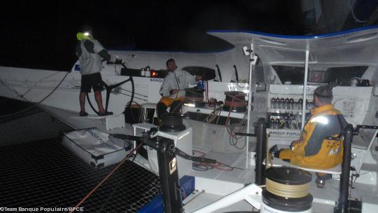 En attendant, au-delà de la perspective d'aller se frotter aux éléments en ce qu'ils ont de plus authentiques, le Team Banque Populaire poursuit sa course contre le temps et contre le tableau de marche de Groupama 3 avec un succès certain. Avec plus de 300 milles d'avance sur cet adversaire, l'heure est plutôt à l'optimisme. À bord, c'est finalement avec une belle sérénité que l'on s'accommode de cette présence virtuelle et pourtant bien réelle. Loïck Peyron et ses comparses jouent certes la montre, mais se focalisent sur un long terme qui tient essentiellement au parfait état général du bateau... et à la météo : " On reçoit toutes les heures nos propres positions et celles de Franck Cammas et ses hommes il y a deux ans en référence. Visuellement, nous savons constamment où ils en étaient au même moment. Mais notre principale préoccupation est la fiabilité de notre machine ".