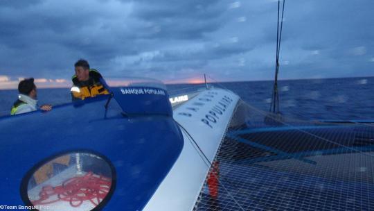 L'express Banque Populaire continue sa descente dans les eaux atlantiques et pointe actuellement au large du Cap Blanc en Mauritanie. Après quelques heures d'un décroché dans l'ouest hier, Loïck Peyron et ses hommes observent de nouveau une trajectoire propre à leur faire gagner du temps dans le Sud. Bénéficiant de conditions de navigation favorisées par un flux de sud-est inhabituel dans cette zone, les marins engrangent les milles mais ne s'économisent aucun effort pour éviter toute sortie de piste. À bord les manœuvres s'enchaînent et les organismes peinent parfois à se recharger.