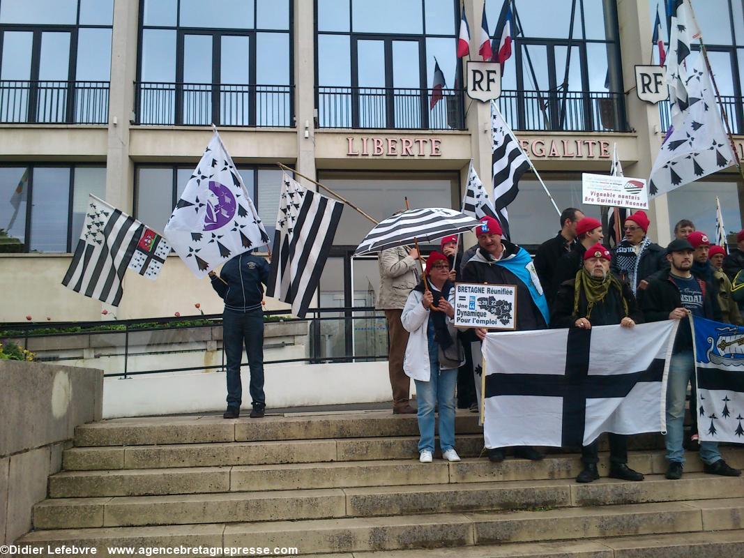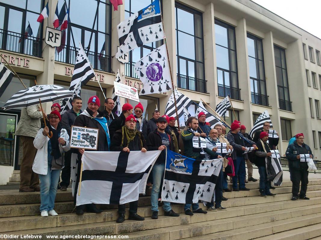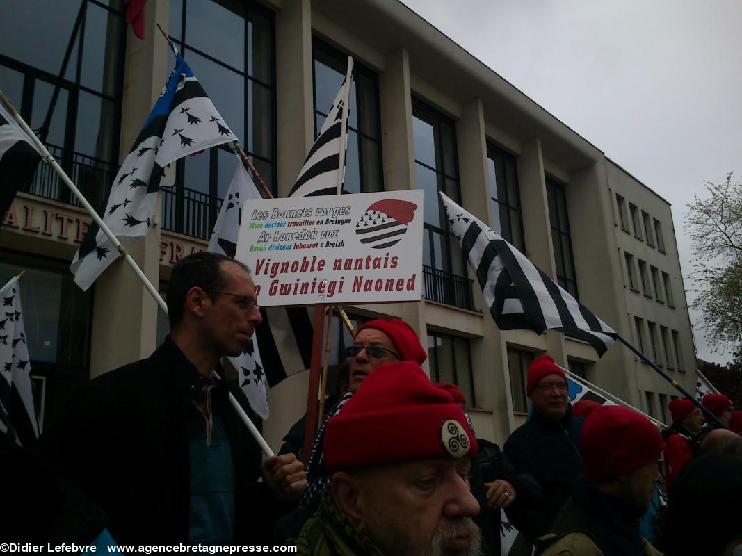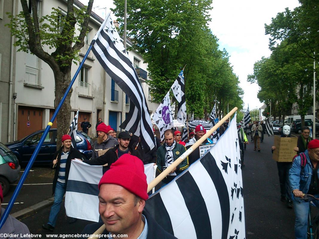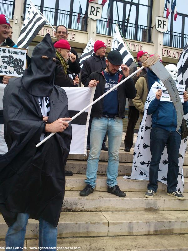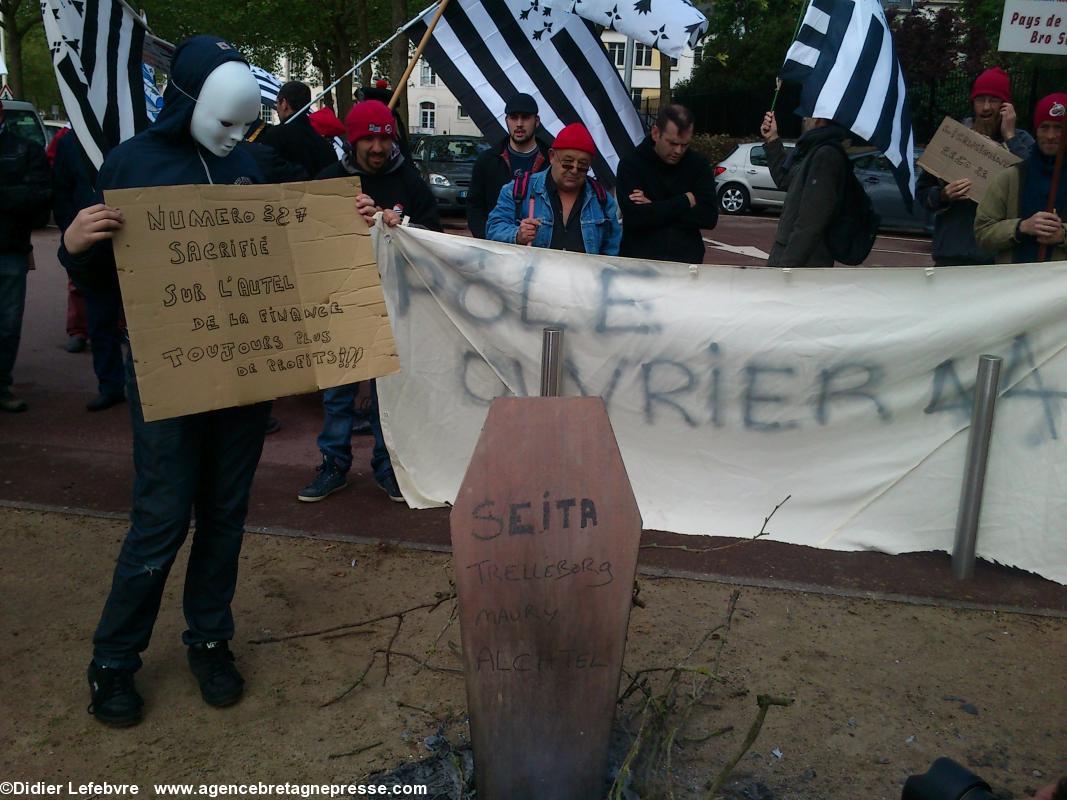 Bon enfant, le cortège s'est dirigé calmement vers la sous-préfecture au son d'une bombarde, et au cri de « Bevet Breizh » (« vive la Bretagne »). Outre les Gwenn-ha-du, on y voit... la Duchesse Anne, dont on célèbre cette année le 500e anniversaire de sa disparition http://annedebretagne2014.wordpress.com/. Les organisateurs avait imaginé y brûler un cercueil, symbolisant la disparition de l'emploi en Loire-Atlantique. Est-ce un bon signe ? Faute de branchettes sèches en quantité suffisante, et d'un bois beaucoup trop dense, le cercueil refusait de brûler. Et comme en Bretagne, tout finit par une chanson, les manifestants ont montré qu'ils avaient de la voix, entonnant le Bro gozh ma zadoù, l'hymne national breton, l'incontournable La Blanche Hermine (chanson) de Gilles Servat, et enfin une chanson militante de Glenmor reprise du Barzaz Breiz : le an Alarc'h http://www.bretagnenet.com/strobinet/barzaz/alarcht2.htm.Notes