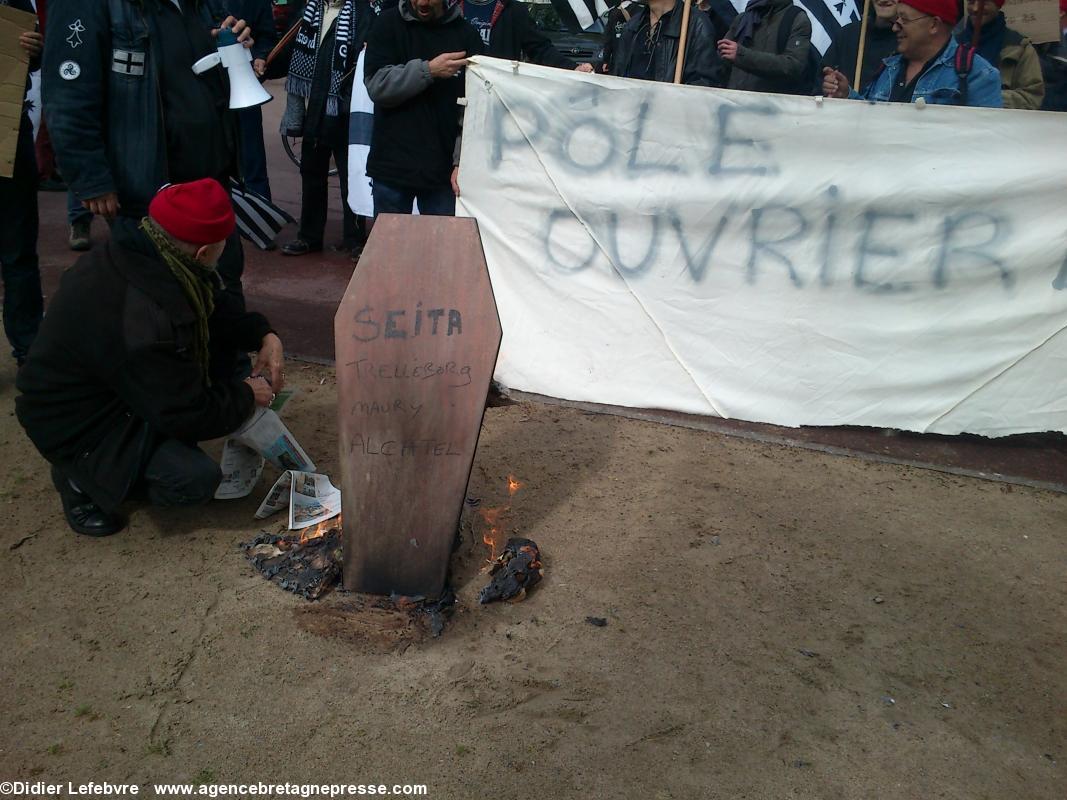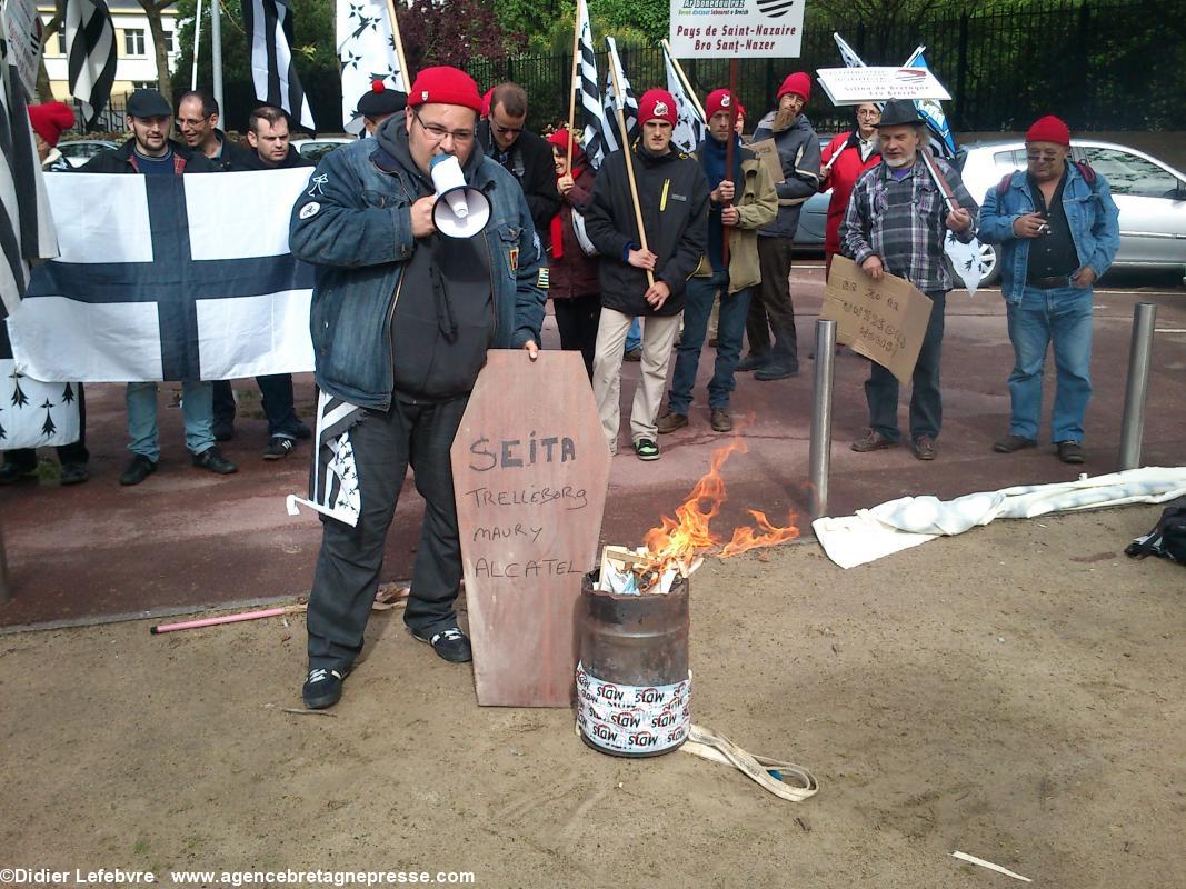 Olier Anezo, du pôle ouvrier 44, est très demandé. Il explique que le « 1er mai est la fête du travail, et que ce jour précis, il est normal que les Bonnets rouges se battent pour défendre l'emploi en Bretagne, plus précisément ici, en Loire-Atlantique ». Des nombreux emplois sont en effet menacés, qu'il s'agisse de la Seita ou Trelleborg (Carquefou)et de Alcatel (Orvault). L'orateur précise que la devise des Bonnets rouges a toute sa signification ici : vivre, décider et travailler en Bretagne. Il est nécessaire de relocaliser les centres de décision, et de cesser de délocaliser l'emploi. Denez, un manifestant, ajoute que la Seita, (plus précisément Impérial Tobacco NDLR) fait des bénéfices et distribue des dividendes de plusieurs centaines de millions d'Euro, mais veut délocaliser l'usine de Kerc'hfaou (le nom breton de Carquefou, NDLR) en Pologne.Aussi sur ABP…Alerte ! Suppression d'emplois. Rassemblement le 25 avril à 13 heures à Carquefou