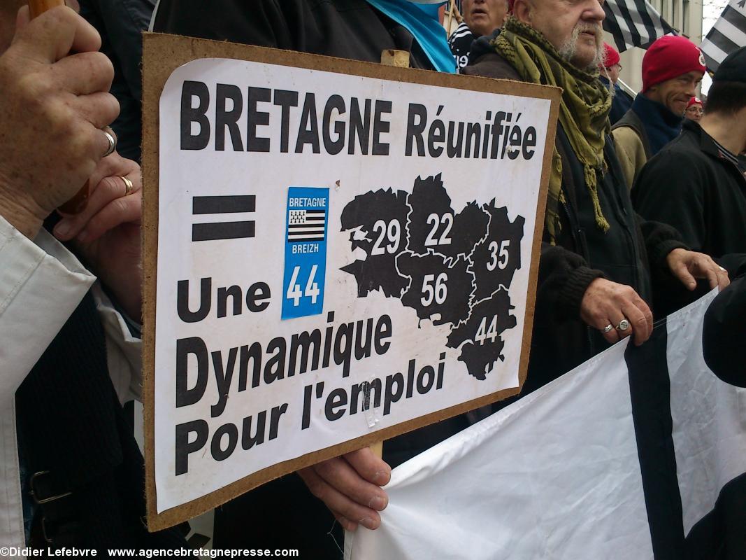 Plus de 10.000 personnes selon les organisateurs, 5.500 selon la préfecture, ont manifesté aujourd'hui à Nantes pour une région Bretagne réunifiée dans une ambiance festive avec cornemuses et des centaines de "gwenn ha du". De nombreux manifestants portaient aussi le bonnet rouge.