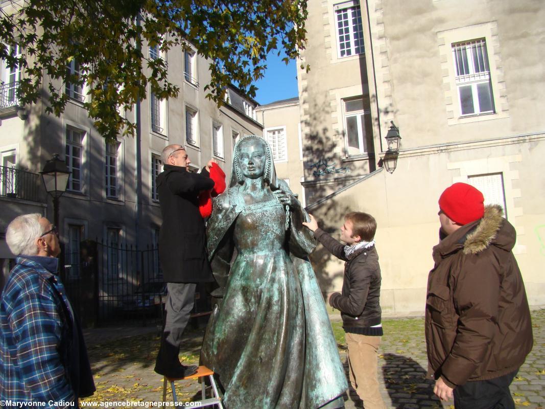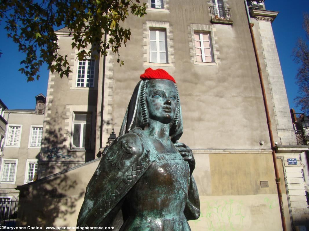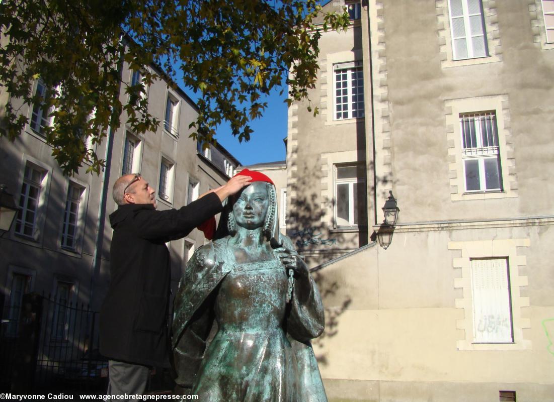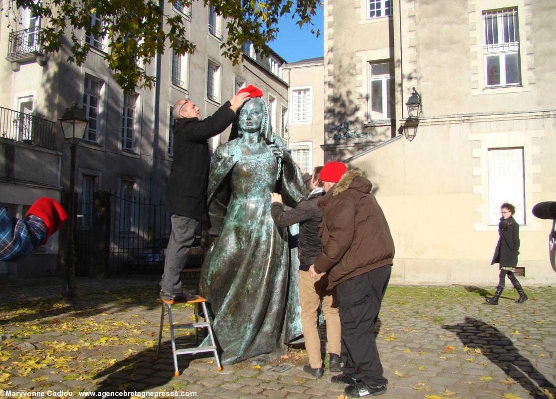 Une séance de photos eut lieu auprès de la duchesse, la statue en bronze de Jean Fréour de 2002 qui marque, selon l’artiste « la réalité de l'appartenance culturelle et historique de Nantes à la Bretagne » et sur wikipédia est ajouté : le costume paysan dont est habillée Anne de Bretagne montre son idéalisation [par Jean Fréour], loin de son personnage réel de princesse médiévale. Ce n’est qu’après le départ de plusieurs personnes que l’idée vint de coiffer Anne d’un bonnet rouge. Le bonnet à pompon tricoté, d’Annick, tenait mieux qu’un bonnet acheté à Kemper le 2 novembre. Reportage en images (ph. 6 à 11). C'est ça qu’elle aurait voulu, kaoc’h ki gwenn, C'est ça qu'elle aurait voulu, kaoc'h ki gwenn ha kaoc'h ki du en détournant gentiment Gilles Servat. Cette chanson a d’ailleurs été citée par Patrick Mahé en son remarquable article dans Le Point titré Bonnet rouge et Gwenn ha Du, daté du 30 octobre, donc avant le rassemblement à Kemper du 2 novembre, où il était alléPlus de 20 000 manifestants à Quimper pour l’emploi en Bretagne