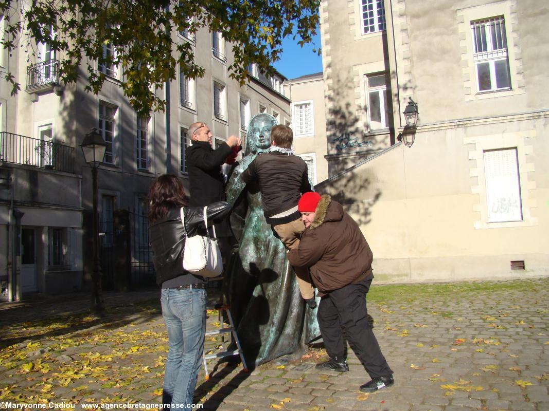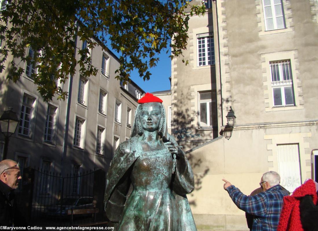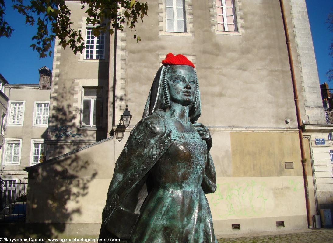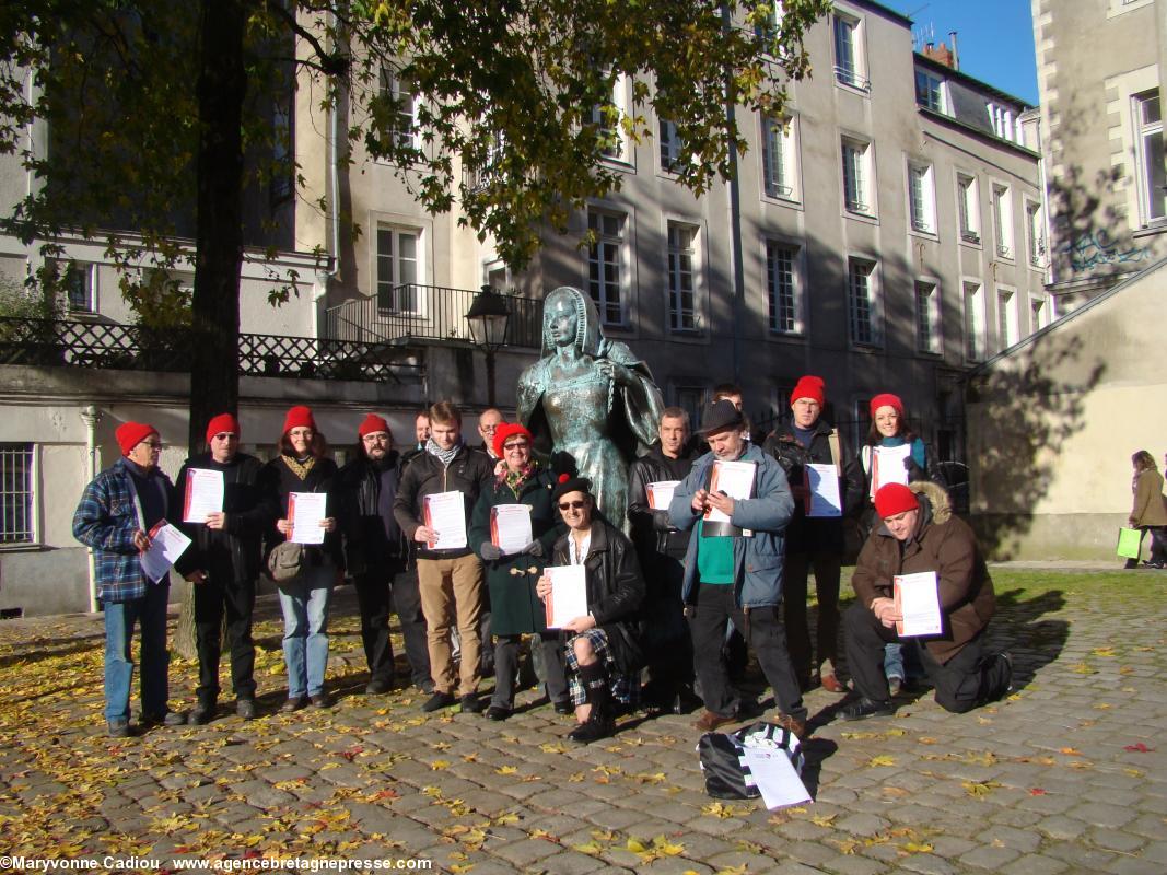 Une séance de photos eut lieu auprès de la duchesse, la statue en bronze de Jean Fréour de 2002 qui marque, selon l’artiste « la réalité de l'appartenance culturelle et historique de Nantes à la Bretagne » et sur wikipédia est ajouté : le costume paysan dont est habillée Anne de Bretagne montre son idéalisation [par Jean Fréour], loin de son personnage réel de princesse médiévale. Ce n’est qu’après le départ de plusieurs personnes que l’idée vint de coiffer Anne d’un bonnet rouge. Le bonnet à pompon tricoté, d’Annick, tenait mieux qu’un bonnet acheté à Kemper le 2 novembre. Reportage en images (ph. 6 à 11). C'est ça qu’elle aurait voulu, kaoc’h ki gwenn, C'est ça qu'elle aurait voulu, kaoc'h ki gwenn ha kaoc'h ki du en détournant gentiment Gilles Servat. Cette chanson a d’ailleurs été citée par Patrick Mahé en son remarquable article dans Le Point titré Bonnet rouge et Gwenn ha Du, daté du 30 octobre, donc avant le rassemblement à Kemper du 2 novembre, où il était alléPlus de 20 000 manifestants à Quimper pour l’emploi en Bretagne