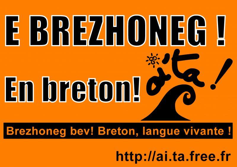 Christian Marquet, maire de Lannuon / Lannion, a décidé de porter plainte contre le collectif Ai'ta ! suite à l'apposition d'autocollants « E brezhoneg ! » sur la signalétique de la commune dont il a la charge et où la langue bretonne est absente.