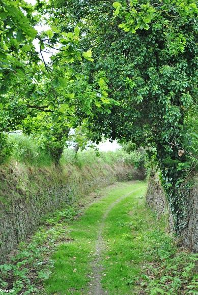 En effet, non loin de Dirinon, dans le bois du Roual, à 500m à l'est du château de Lesquivit, se trouve un chemin superbement ombragé qui file au nord puis rejoint une route communale au bout d'un kilomètre. Ce chemin, voie antique sans doute, qui reliait Morlaix à Quimper en suivant les fonds de rias, est encore dessiné sur la carte de Cassini du 18e; (note 5) et sur la carte d'état-major de 1820-1866 (ref 1). Une route ponctuée de calvaires, en lieu et place de bornes milliaires (tous les 1460 mètres) ou d'anciens oratoires ? On remarque les vestiges de cette voie dès avant Kermelenec, jusqu'à Mont dragon; au sud, elle rejoint Daoulas par la rue de Goarem Bian.