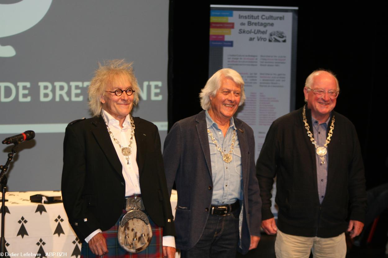 La cérémonie officielle et protocolaire des remises des Hermines commence ensuite, et la 1re Herminée est Anna Mouradova. Une sombre histoire sanitaro-diplomatique la laisse bloquée en Georgie. Que le Cabinet du ministre Le Drian n’a su résoudre. Son Collier lui sera remis sur place plus tard. C’est à Tbilissi (Georgie), oui-oui, et auparavant à Moscou (Russie), que cette jeune enseignante et écrivaine enseigne la langue bretonne. Elle apprit la langue bretonne seule. Toujours dans le domaine de la langue, l’Herminé suivant est le pêchu Jorj Belz. « Je suis devenu un étranger dans la terre où je suis né, ne pouvant parler ma langue. Interdite par les Français. Mais je vois la renaissance de la langue, peut-être différente de celle que parlait nos parents, mais elle revit. Je le vois sur les panneaux, à la radio, dans les écoles ». Pascal Jaouen le fameux brodeur quimpérois, a ceci de commun avec son prédécesseur Herminés, et ses successeurs aussi, c’est le collectage. Lui, il a collecté les costumes, les techniques, et il leur a donné une nouvelle vie, avec le brio que l’on sait. Il commence à apprendre le breton, car, dit-il, « On se dit tous Bretons, et on ne parle pas breton ».Les Tri Yann, égaux à eux-mêmes