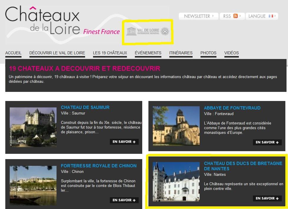 Sous le titre Val de Loire : l'Unesco recadre les châteaux, Marc Le Duc de Ouest France, écrit un splendide article. Le sous-titre : L'Unesco ne veut pas que son logo figure sur une information touristique où le château des Ducs de Bretagne devient château de Loire.
