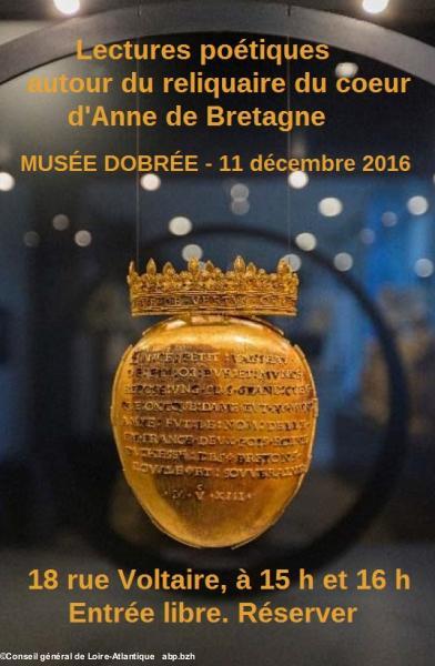 Lecture de poésie au musée Dobrée autour du reliquaire du coeur d'Anne de Bretagne. 11 décembre 2016. 15 h et 16 h. Communiqué de presse