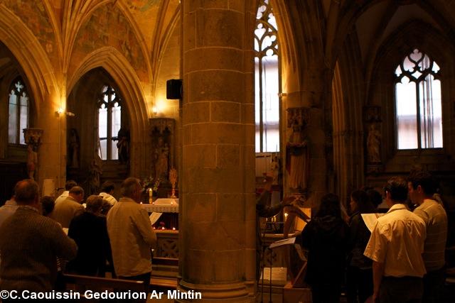 A l'occasion du pardon de Kernascléden (56), une veillée d'adoration eucharistique en breton, latin, français est proposée, avec cantiques bretons traditionnels et polyphoniques, harpe celtique, flûte, ...