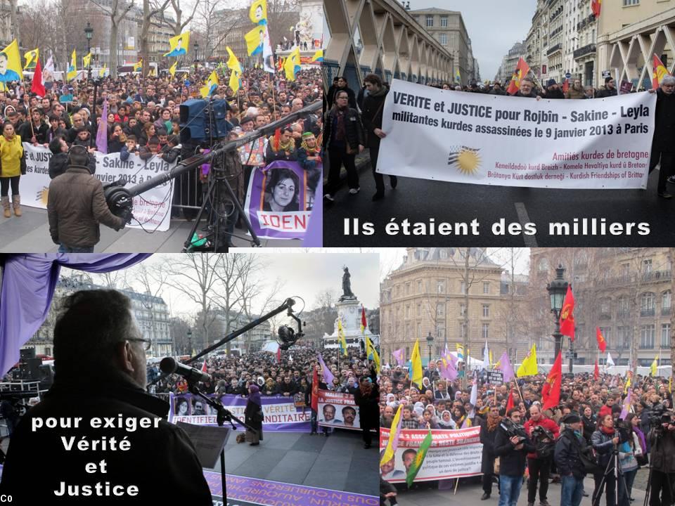 A l'heure où le nom de Nelson Mandela est sur toutes les lèvres, il est impossible pour les Kurdes et ceux qui les soutiennent de ne pas faire le rapprochement entre Mandela et Öcalan (leader kurde emprisonné à vie), l'ANC et le PKK (deux organisations dont l'une, le PKK, est toujours considérée comme terroriste), Dulcie September et Rojbîn (toutes deux en poste à Paris et assassinées dans leurs bureaux).La Fédération des Associations kurdes de France (Feyka), la Coordination nationale Solidarité Kurdistan (CNSK), le Parti communiste français (PCF), Femmes Solidaires, la Marche Mondiale des Femmes, le Mouvement contre le racisme et pour l'amitié entre les peuples (MRAP), le Mouvement de la Paix, Le Nouveau Parti anticapitaliste (NPA), la communauté tamoule, les organisations de la gauche turque, mais aussi les antifascistes allemands étaient présents. Des députés européens, des maires, des élus locaux ont également pris part à la manifestation. Parmi les nombreux orateurs on citera Remzi Kartal, co-président du Congrès du Peuple du Kurdistan (Kongra-Gel), Pierre Laurent, sénateur, président du parti de la gauche européenne et secrétaire national du PCF, Aysel Tuğluk, députée de Van, co-présidente du Congrès pour une société démocratique (DTK).Tous ont alternativement crié leur indignation.Les familles des victimes sont également intervenues dans la dignité.