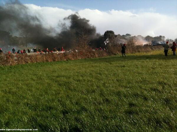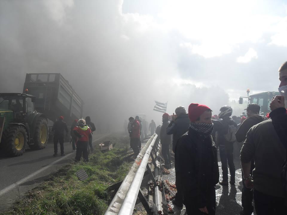 Le samedi 15/02/14, entre Vannes et Lorient, après avoir rallié l'aire de covoiturage de Landaul, près du restaurant du Poulvern, les Bonnets rouges se sont rassemblés devant le portique écotaxe de Brec’h.