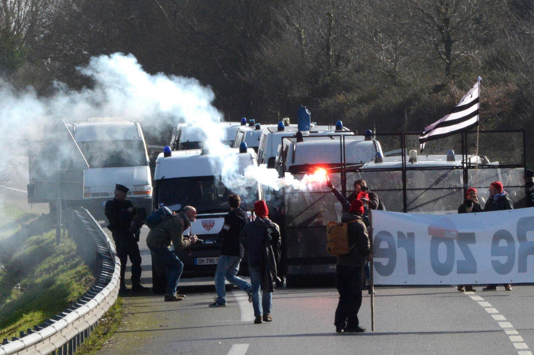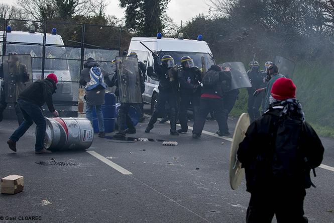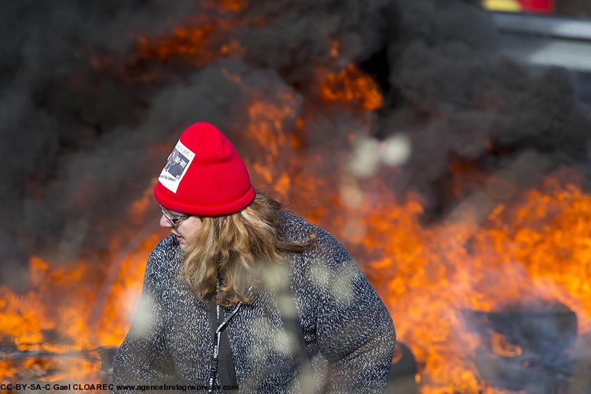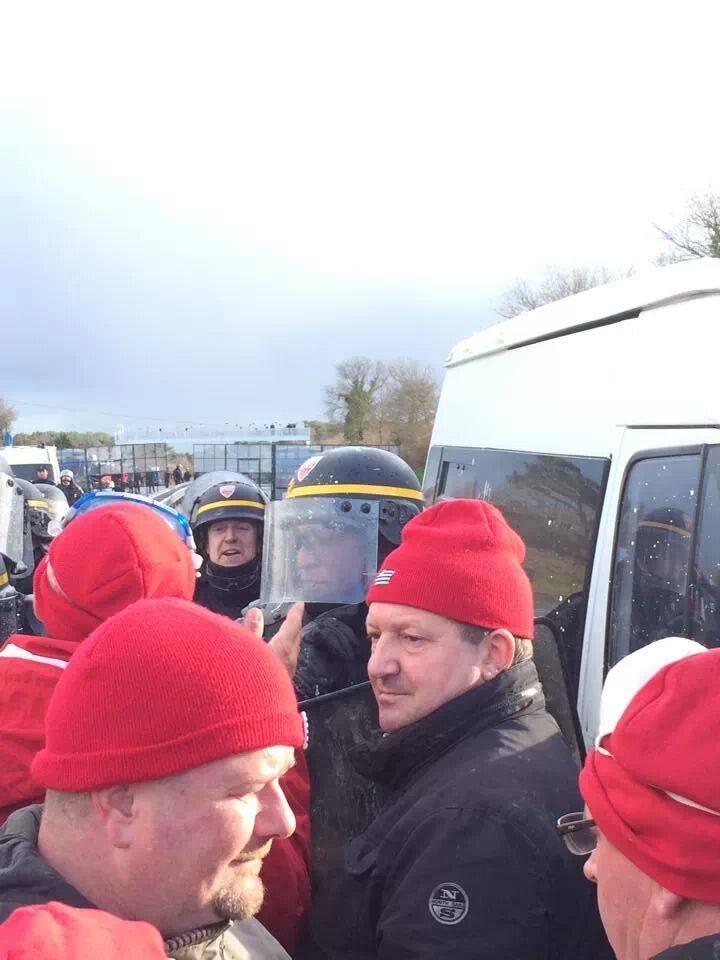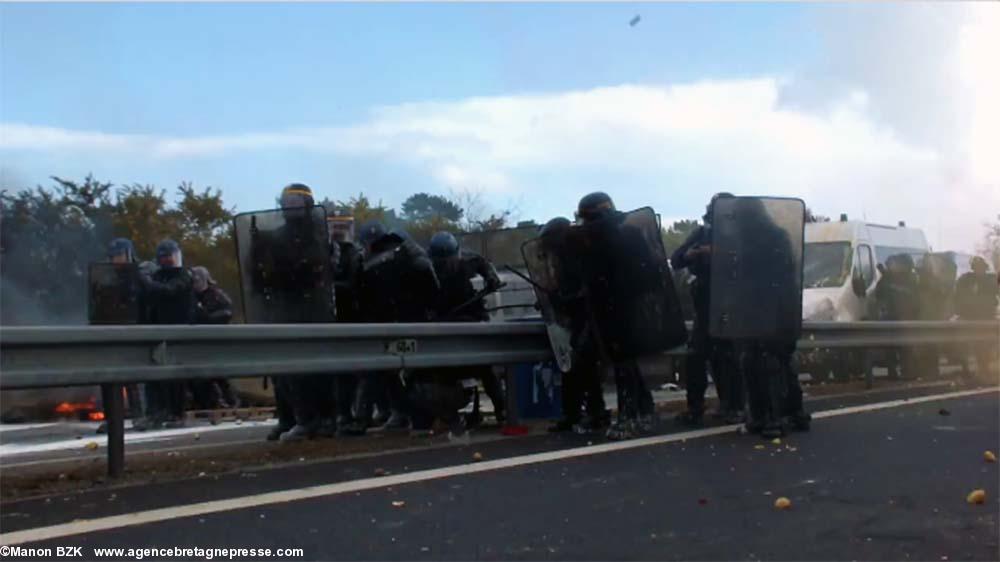 Les forces de l'ordre étaient, elles aussi, au rendez-vous et elles avaient demandé aux manifestants de retarder leur départ de quarante-cinq minutes pour pouvoir préparer leur barrage. Une fois le convoi des Bonnets rouges entré sur la quatre-voies, tous les accès en ont été barrés, y compris pour les tracteurs.