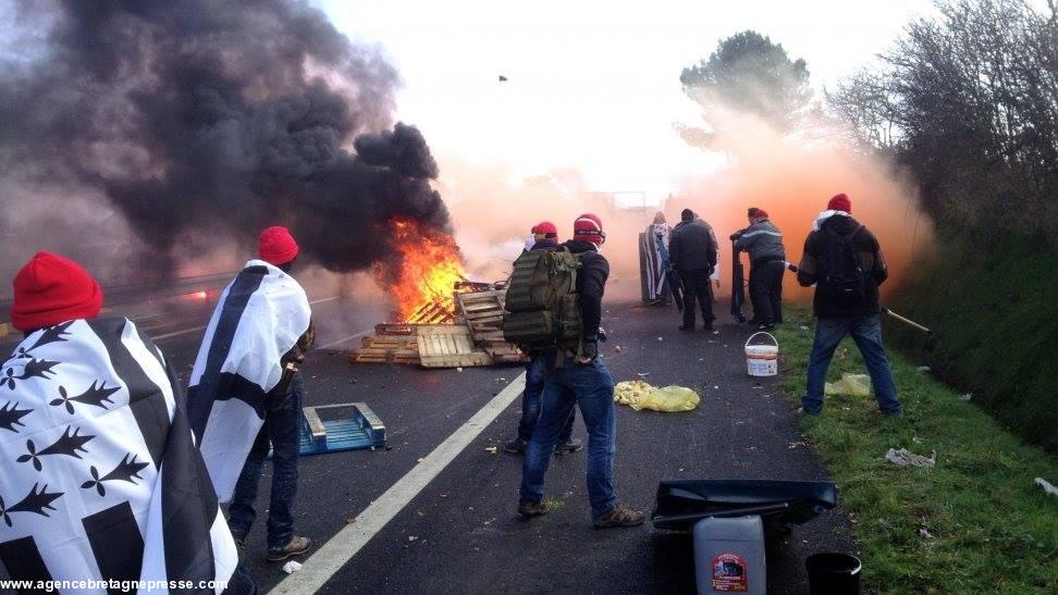 Le samedi 15/02/14, entre Vannes et Lorient, après avoir rallié l'aire de co-voiturage de Landaul, près du restaurant du Poulvern, les Bonnets rouges, au nombre d'environ 400, se sont rassemblés devant le portique écotaxe de Brec’h.
