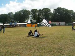 A Carhaix, le bonheur est dans le pré. C'est vrai que, dans la plaine de Kerampuilh, la bonne humeur est contagieuse. Les festivaliers, notamment les jeunes, se retrouvent gaiement par tribus qui maquillées qui déguisées. L'édition 2010 est placée sous le signe du western et de la ruée vers l'Ouest, ce qui nous vaut quelques panoplies de cow-boys de derrière les fagots. Parmi les signes de ralliement, se démarquent les ballons colorés à l'effigie de Bob l'éponge, de Barbapapa et d'autres super héros ou les drapeaux à l'image de cet énorme gwen ha du formé de strings noirs et blancs.
