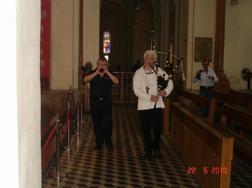 Selon une tradition désormais bien établie à Saïgon, la communauté s'est retrouvée à la cathédrale Notre Dame de Saïgon pour une célébration et un dépôt de gerbes à l'offertoire de Saint Yves et de Sainte Anne à l'intérieur de la cathédrale. Après une lecture de l'évangile et un rappel des traits de la vie de Yves Helory de Kermartin, nous avons pu, accompagnés par nos sonneurs de grande cornemuse, de bombarde et d'orgues, entonner les cantiques à Saint Yves et à Sainte Anne. Les festivités profanes se sont ensuite déplacées au parc de Binh Quoi décoré de Gwen Ha Du, de drapeaux des pays celtiques d'outre-Manche et de guirlandes aux couleurs de la Bretagne. Plus de 600 personnes sont venues participer à cette Gouel Erwan 2010 et partager de forts moments de convivialité et de « Bretonnitude ». Les visiteurs ont pu visiter les divers stands. • Culture avec une exposition de livres bretons et en breton • Conférences : o Xavier Grall, Poète Breton o Saigon : Développement urbain depuis 1780 o Le Fest Noz, origine et histoire • Politique, la partition de la Bretagne avec une exposition de documents fournis par « Bretagne Réunie » • Économie, avec une exposition de produits et services proposés par les entreprises d'origine bretonne qui soutiennent la manifestation • Gastronomie, exposition et dégustation de produits bretons, irlandais, écossais importés ou produits sur place au Vietnam